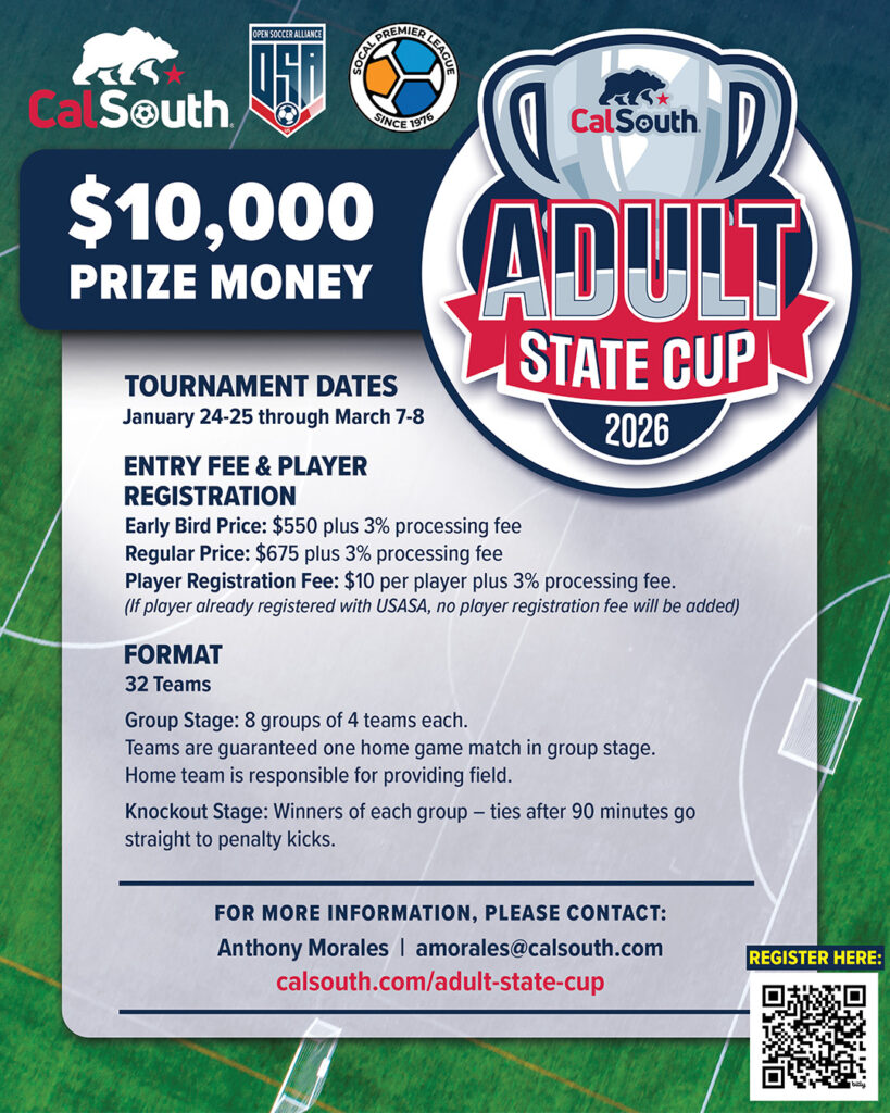 The Cal South Adult Open State Cup is a marvelous opportunity for men’s soccer teams across Southern California to come together and compete over an incredible prize. Register today!