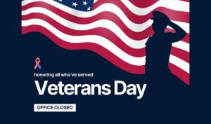 Our office will be closed at 12:00 PM PST on Tuesday, November 11, 2025, in honor of Veterans Day — a time to recognize and thank all those who have served and continue to protect our country and its people.