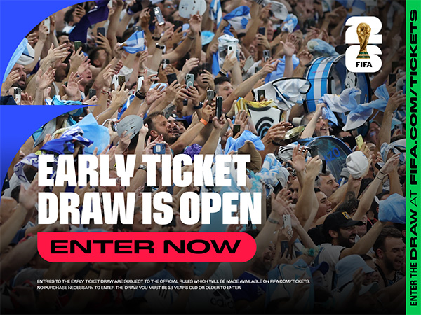 The Early Ticket Draw entry period is here! Enter the draw at any point now through 11am ET on Friday 31 October for a chance to purchase FIFA World Cup 26™ tickets. Please note the timing of your entry during the advised window will not impact your chance of success.
