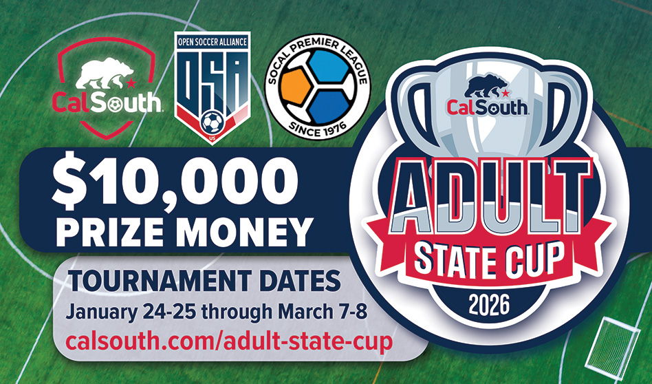 The Cal South Adult State Cup is back again for 2026! This year’s intensely competitive tournament will feature a Men’s Open division where the best adult soccer teams from across California will compete for a chance to win a $10,000 grand prize and the title of State Champion!